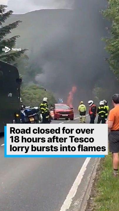 Road closed for over 18 hours after Tesco lorry bursts into flames