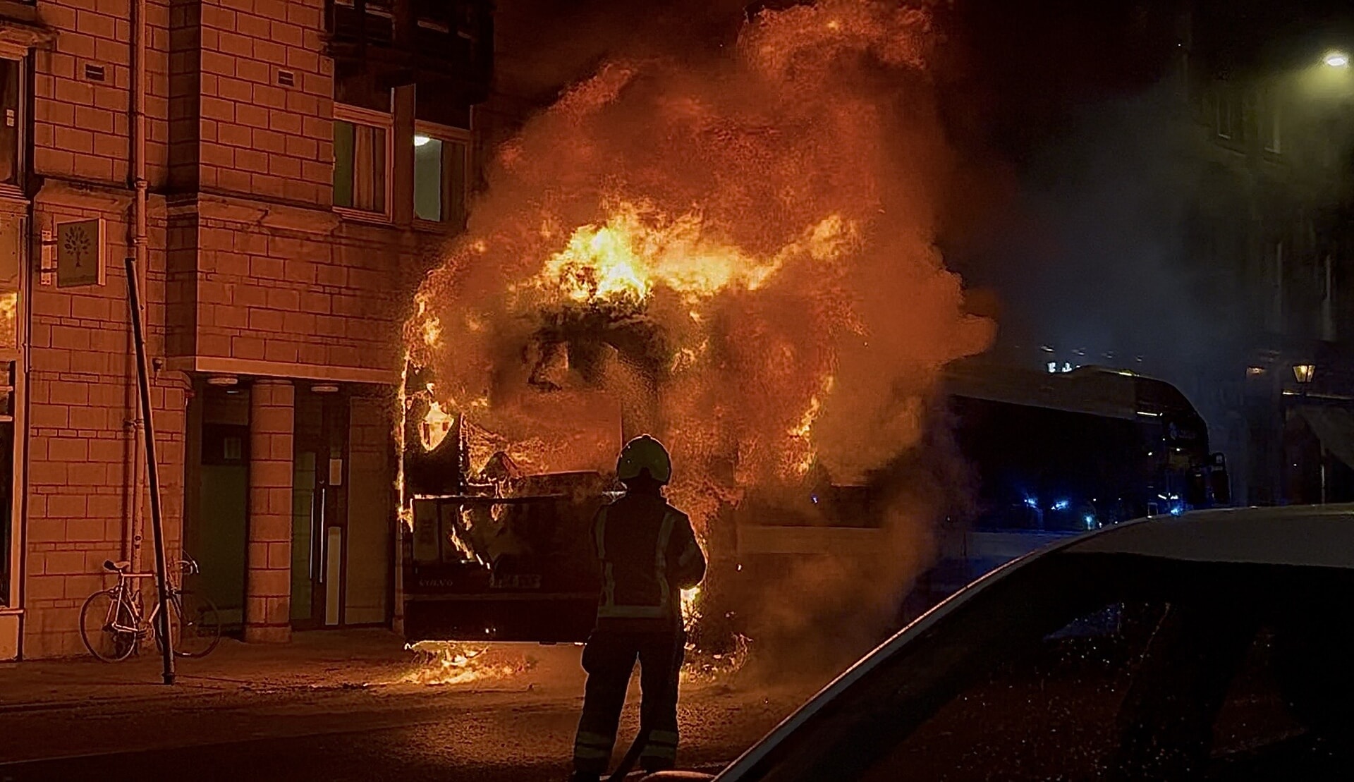 The Lothian Buses service caught fire on South Clerk Street just before 7.30pm, with the rear part of the single decker bus engulfed in flames.
