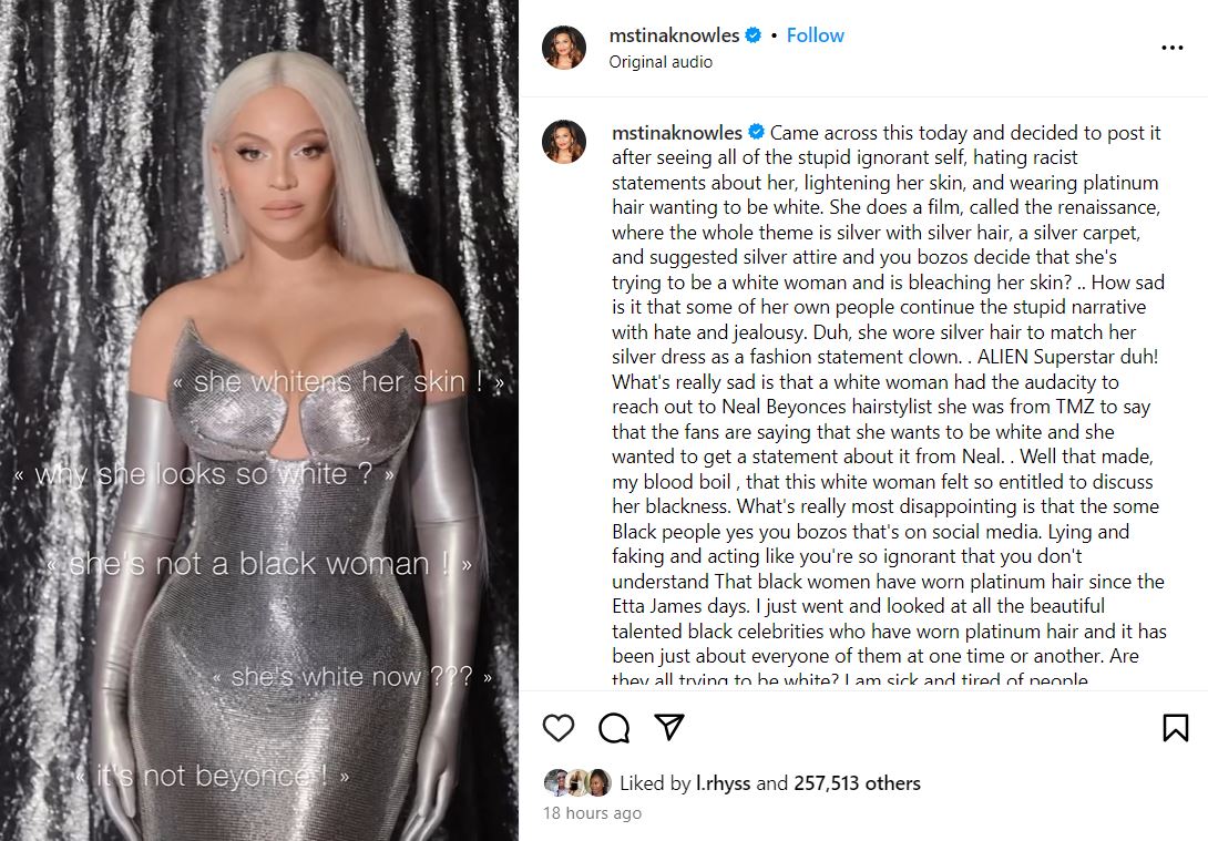 Tina Knowles took to social media to dispute the allegations her famous daughter had been “lightening her skin” for the premiere of her film Renaissance.