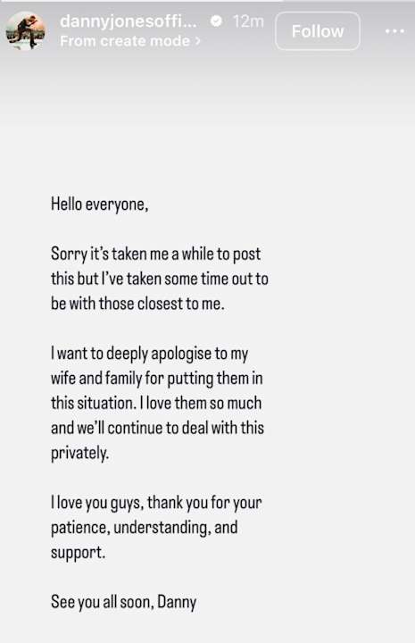 “I want to deeply apologise to my wife and family for putting them in this situation. I love them so much and we’ll continue to deal with this privately.