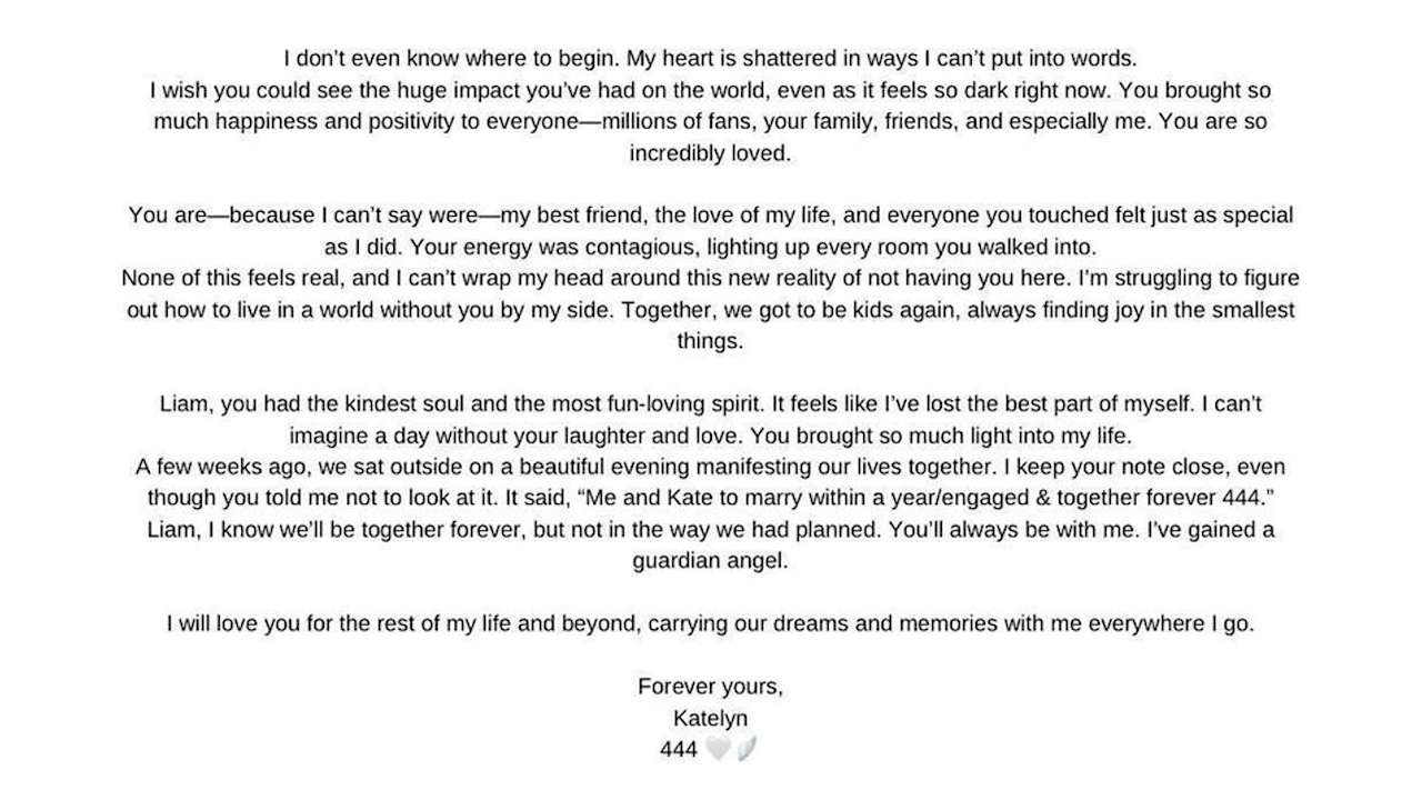 “I will love you for the rest of my life and beyond, carrying our dreams and memories with me everywhere I go,” she wrote, signing off with: “Forever yours, Katelyn”.