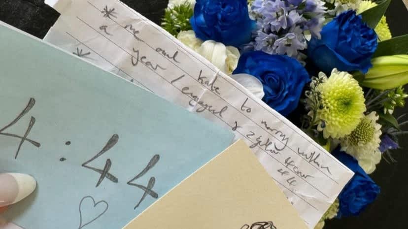 “I kept your note close, even though you told me not to look at it. It said, “Me and Kate to marry within a year [or] engaged and together forever”.