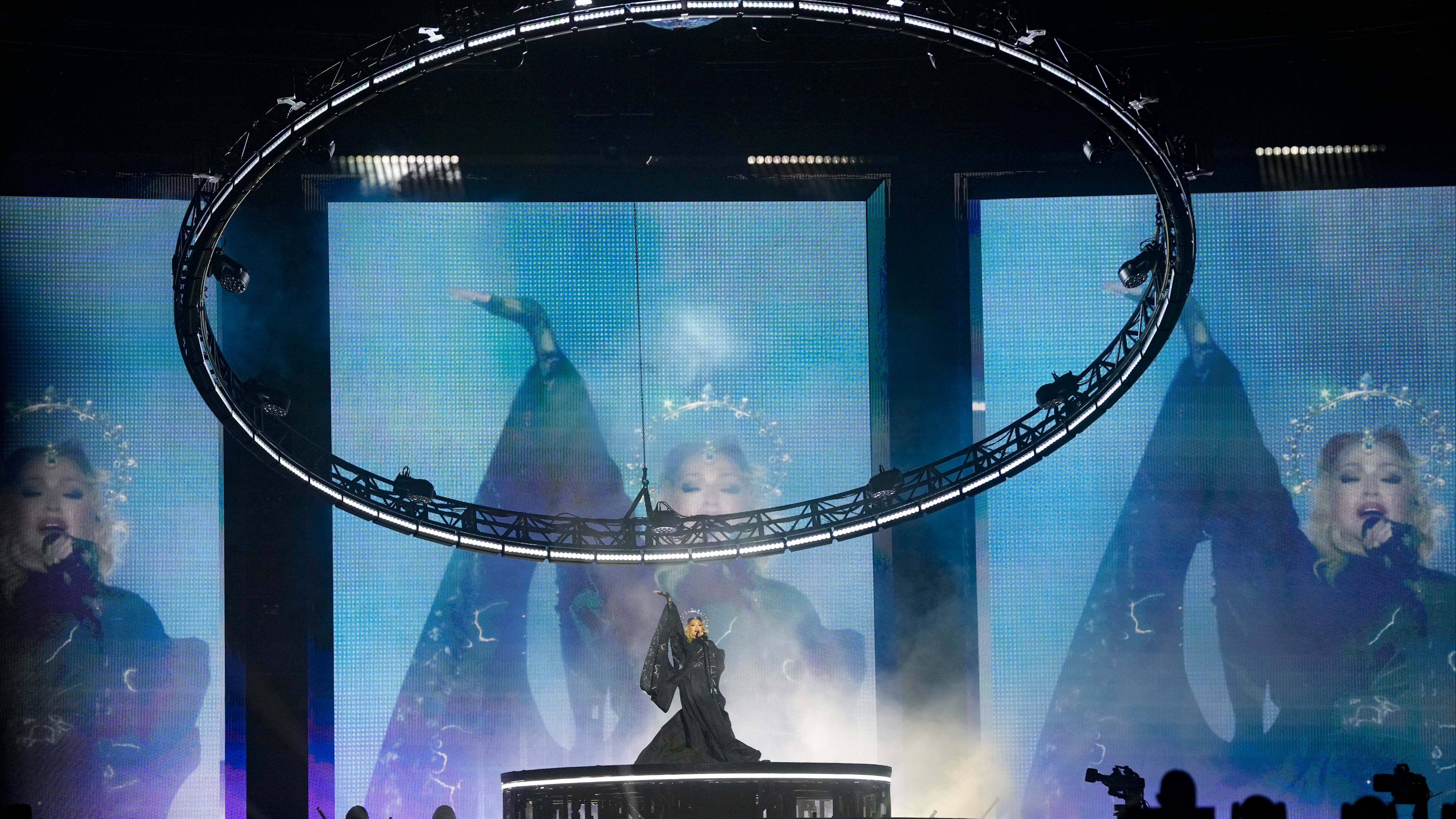 Madonna performed her classic hits, including “Like A Virgin” and “Hung Up.” For the introduction to “Like A Prayer,” her head was completely covered in a black cape, a rosary gripped in her hands.