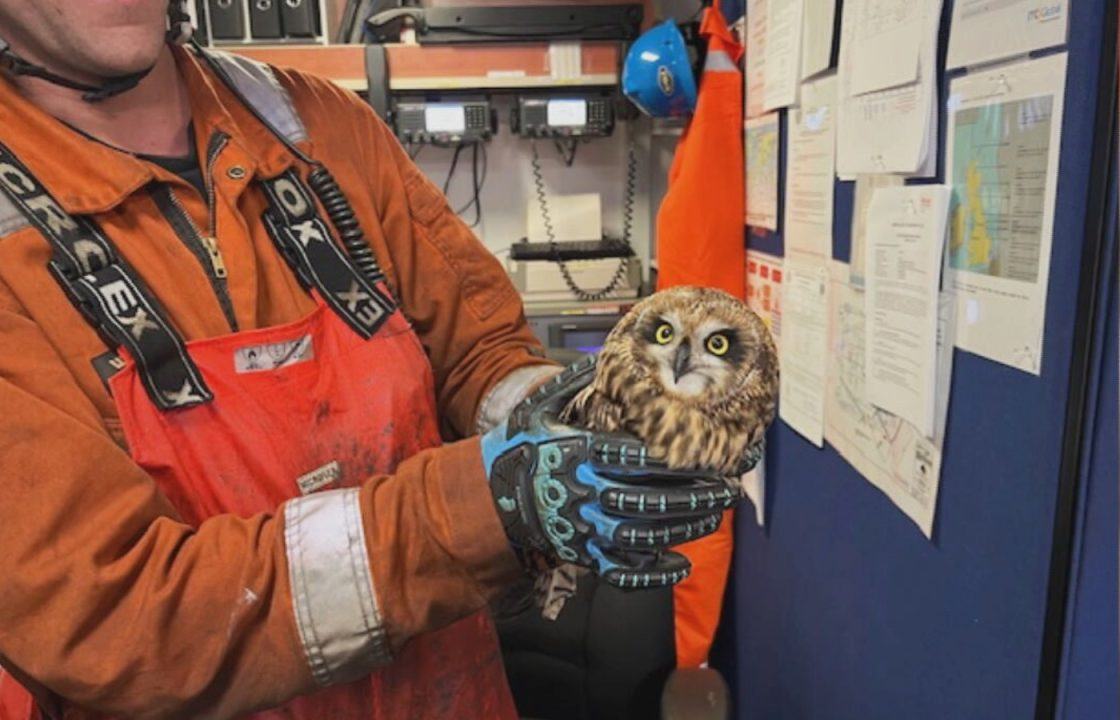 A short-haired owl, which found itself stuck on an oil rig after being blown off course during Storm Amy, is being looked after by animal rescuers.