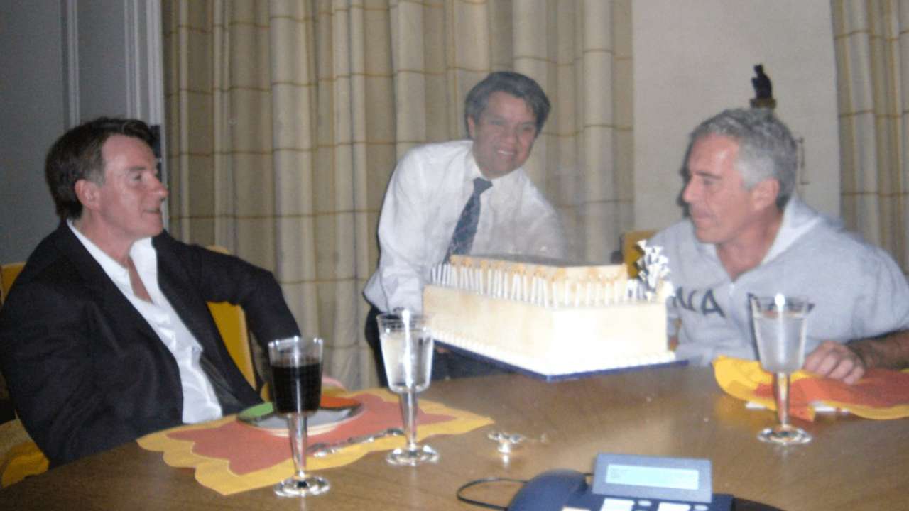 A photo released by us officials showing Lord Mandelson and Jeffrey Epstein together with a cake. / Credit: PA