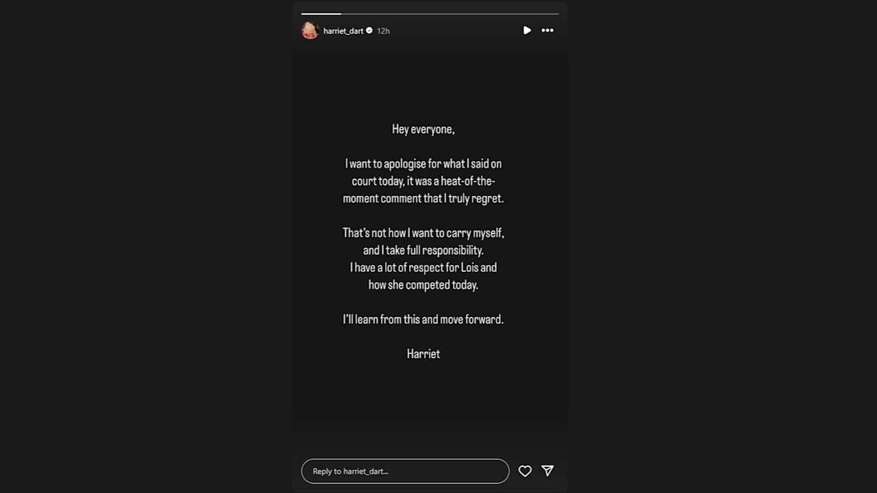 “That’s not how I want to carry myself, and I take full responsibility. I have a lot of respect for Lois and how she competed today. I’ll learn from this and move forward. Harriet.”