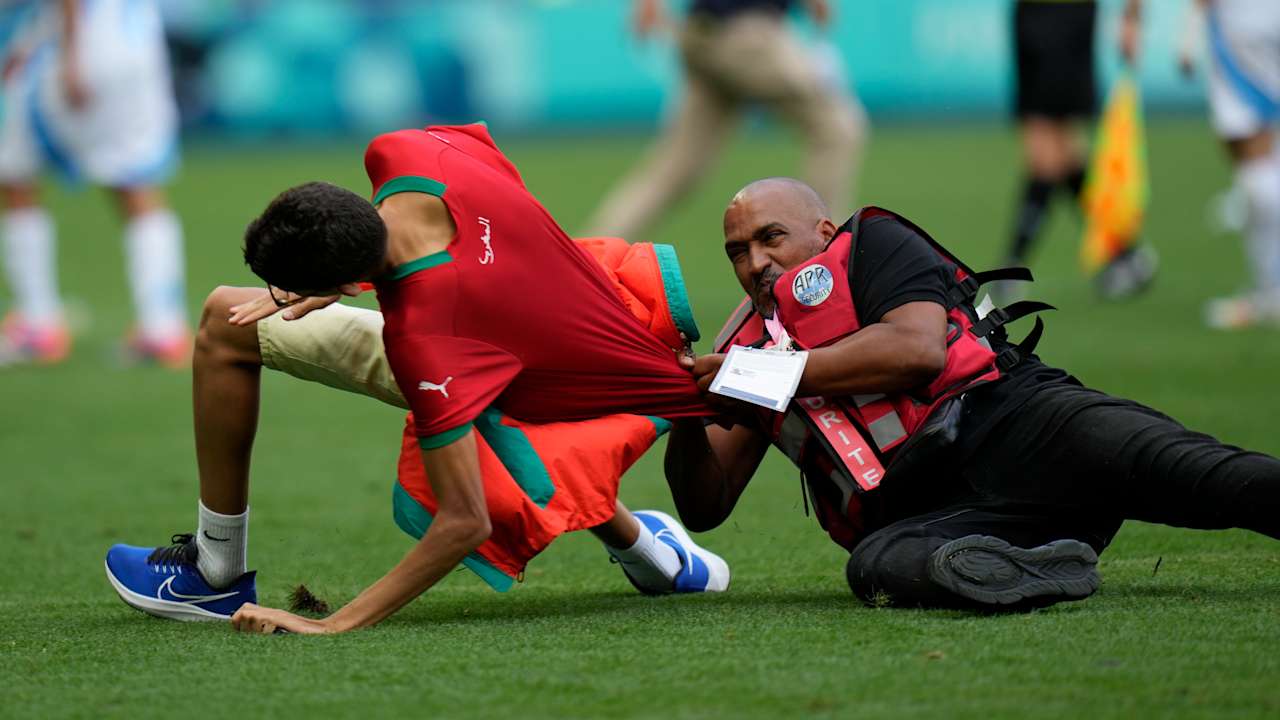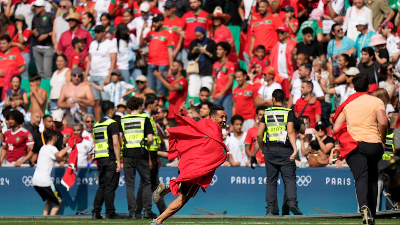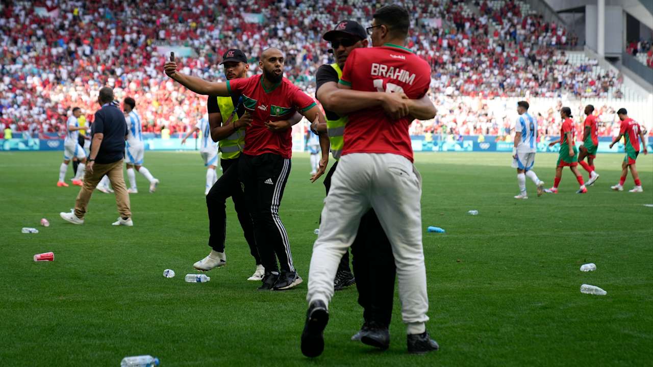 Morocco fans swarmed onto the pitch in protest against a late equaliser from Argentina during the opening match of the Paris Olympics men’s football tournament.
