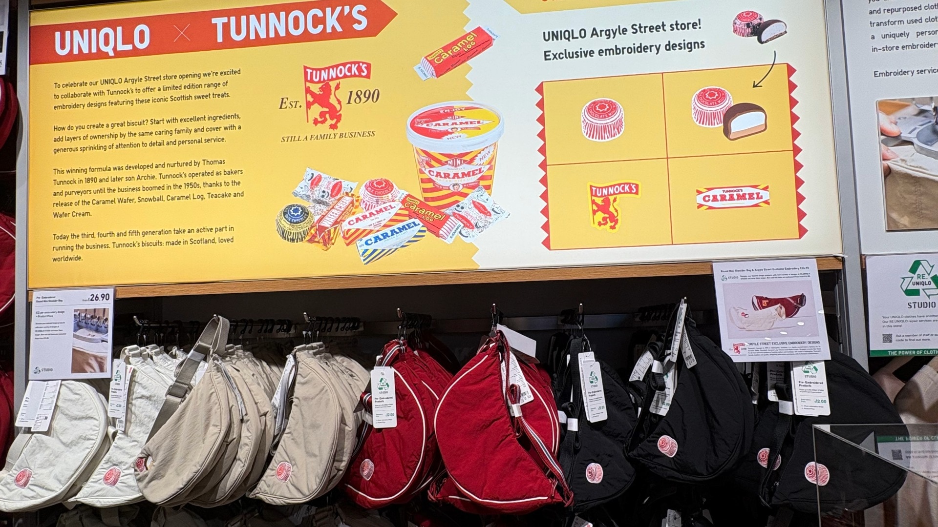 The brand has also partnered with Tunnocks to create an exclusive range of tote bags and scarves featuring images of caramel wafers and tea cakes, available for a limited time.