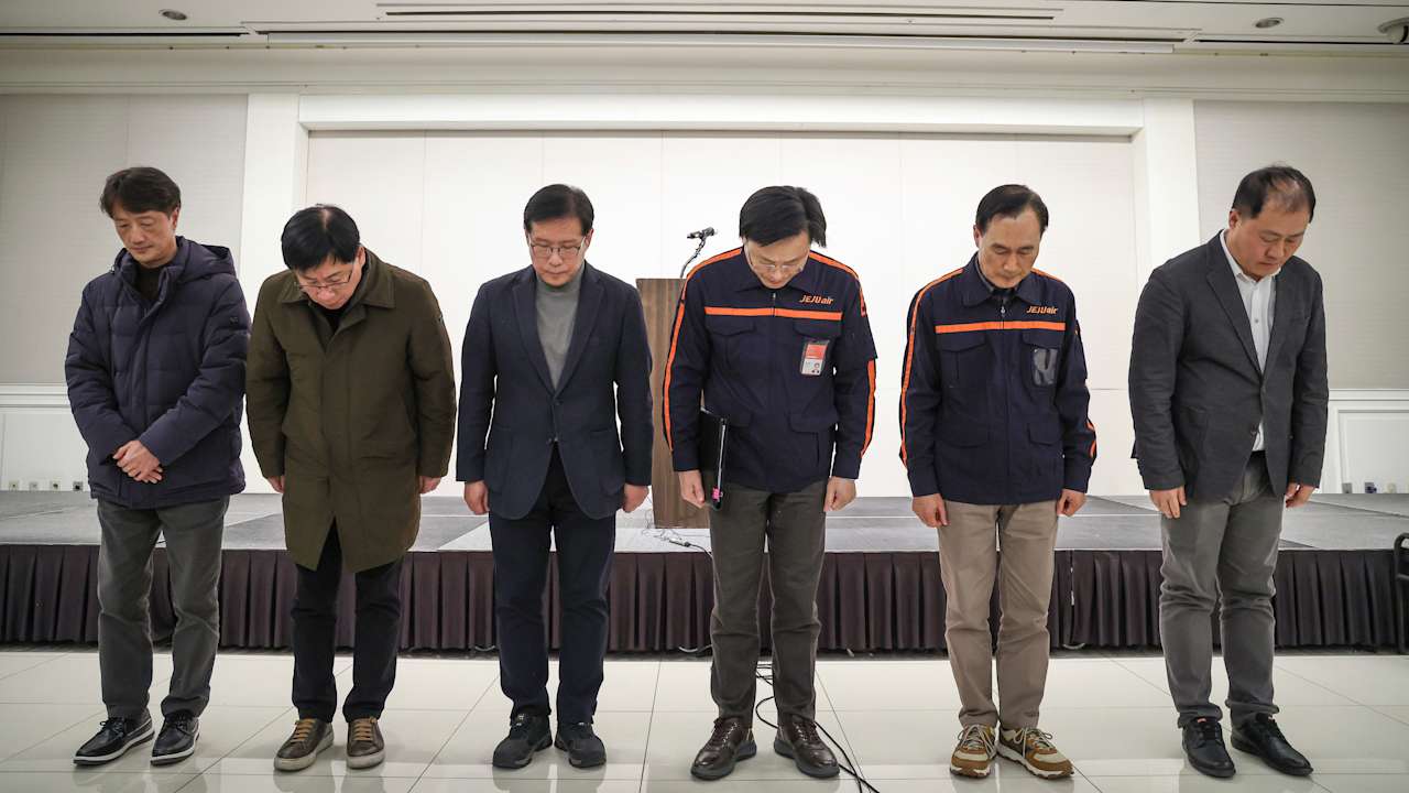 In a televised news conference, Jeju Air’s president Kim E-bae bowed his head alongside other senior company officials as he apologised to bereaved families. He added he feels “full responsibility” for the incident.