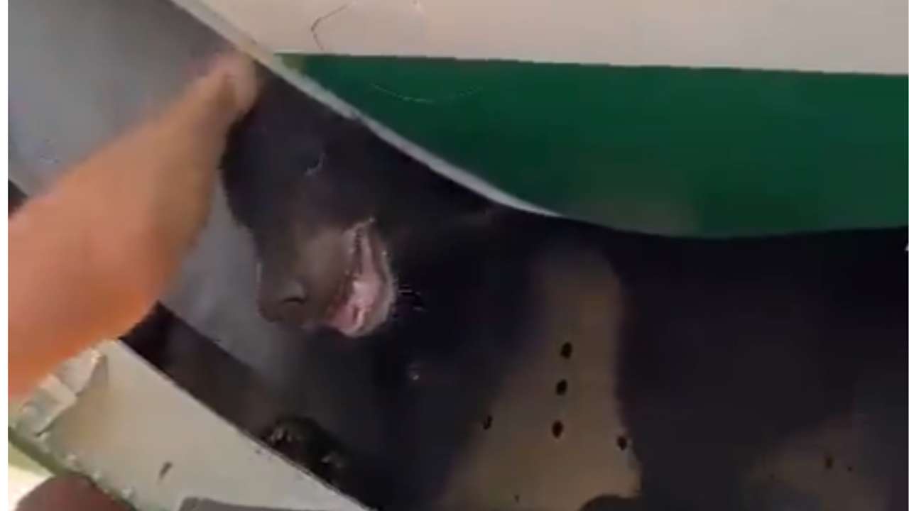 In another video, the bear can be seen poking its head out of the hold.