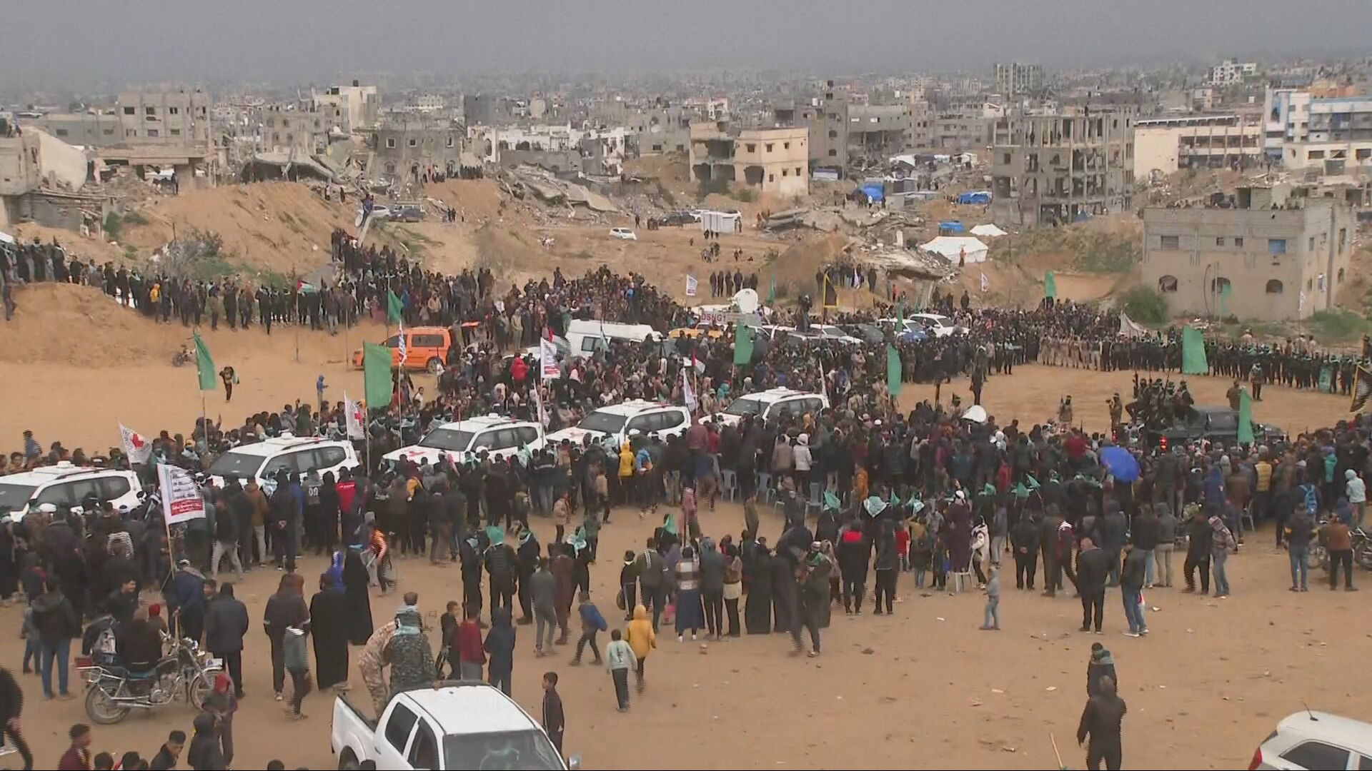 Red Cross vehicles arrived at the site where the handover took place, as hundreds of masked militants and onlookers gathered with flags and banners.