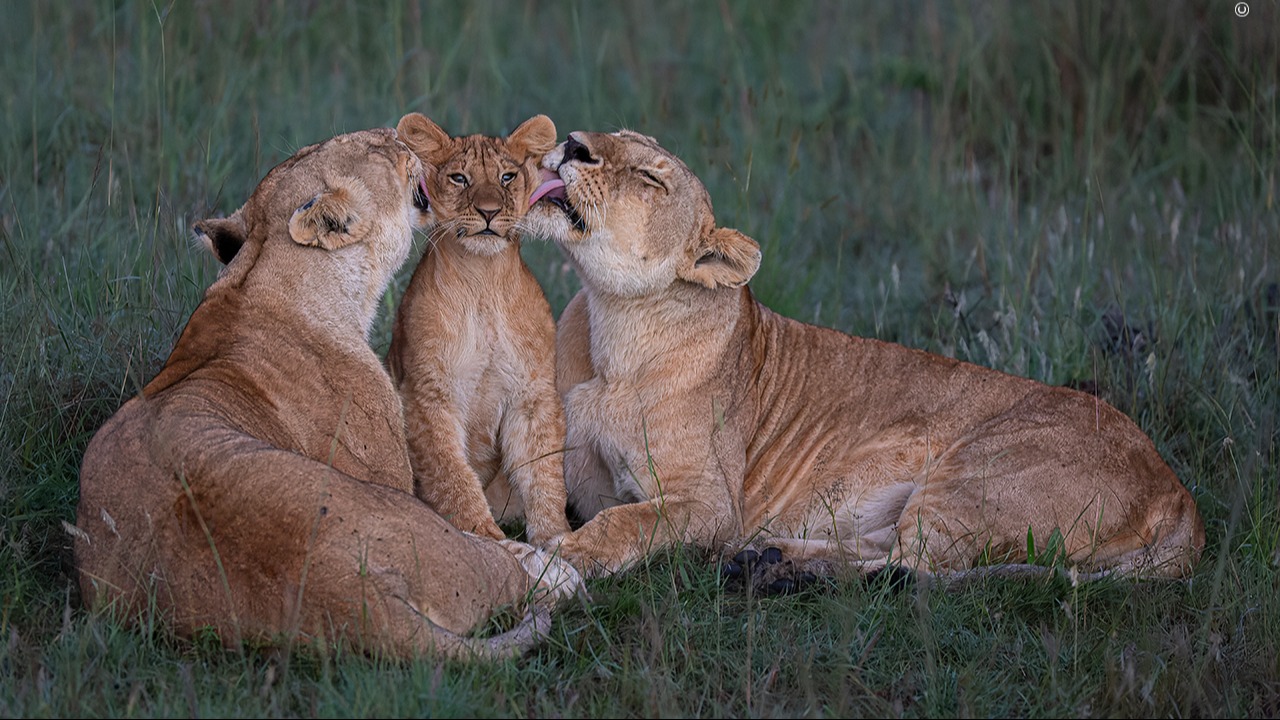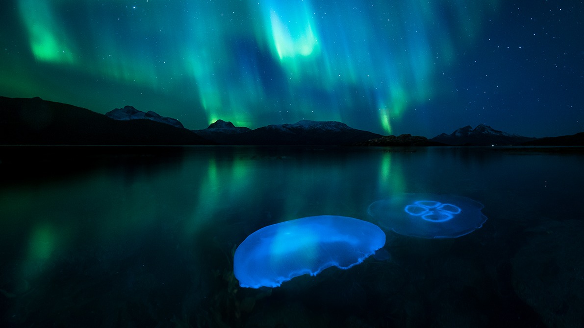 Two lionesses grooming a cub and two moon jellyfish illuminated by the aurora borealis in a fjord in Norway were also among the highly commended finalists in the public vote.