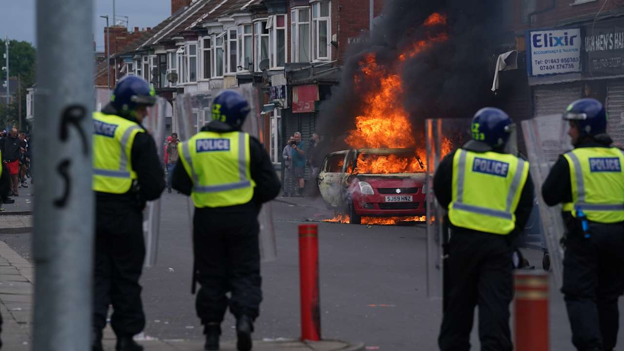 A group of rioters in Middlesbrough smashed the windows of houses and cars, and threw objects at officers on Sunday afternoon, with one seen shouting a racial slur and another telling police: “It’s our f****** country.”