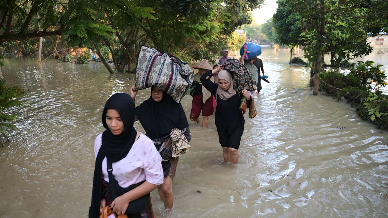 People carry their belongings as they wade through the water at a flooded village in Bireun, Aceh province, Indonesia. / Credit: AP