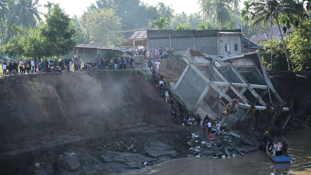 People walk down the embankment of a river to take a boat ride across after a bridge nearby collapsed during a flood in Bireun. / Credit: AP