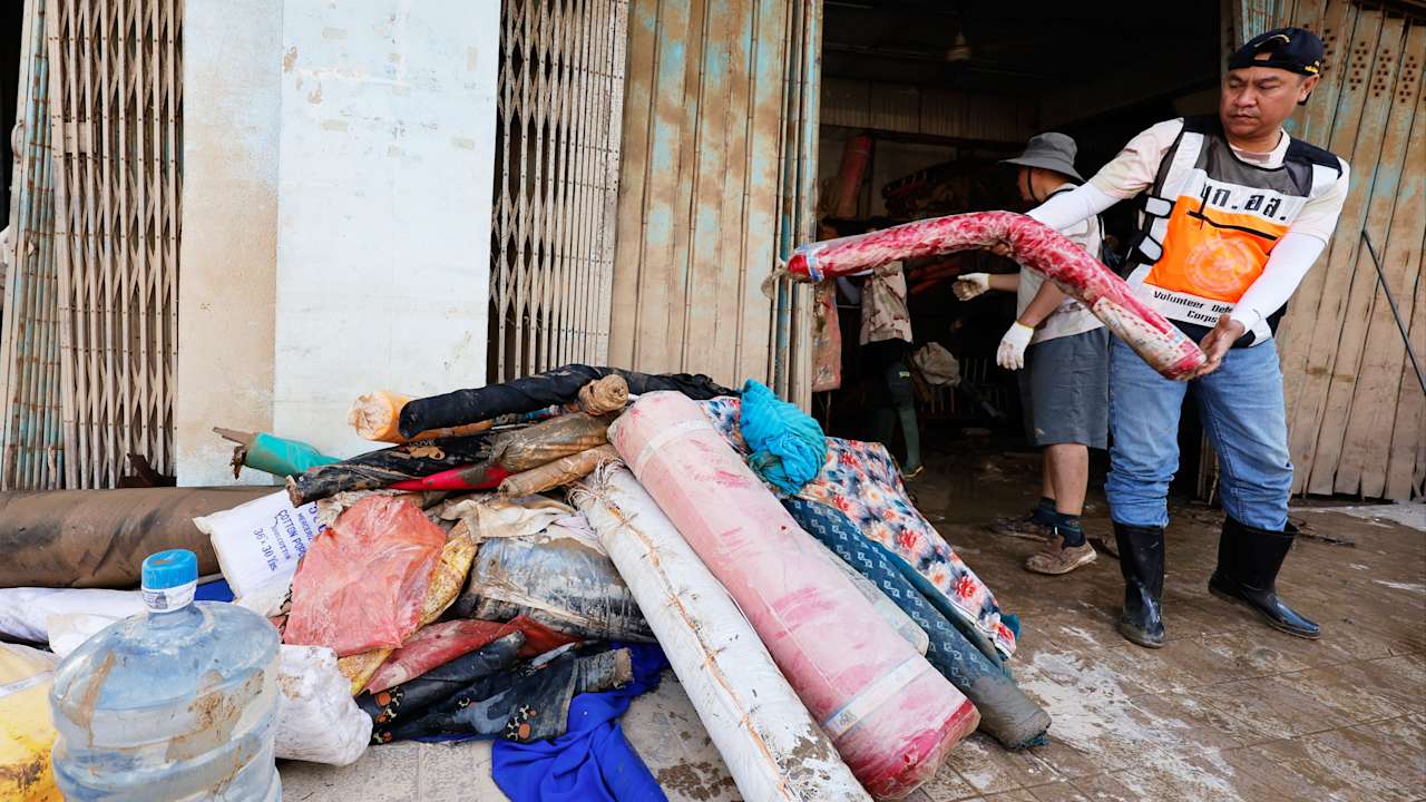 Volunteers move rolls of fabric damaged from floods in Songkhla province, southern Thailand. / Credit: AP