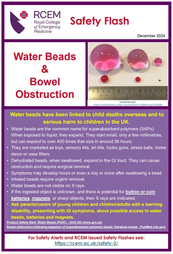 The Royal College of Emergency Medicine (RCEM) has issued a “safety flash” over water beads, which are marketed as toys.