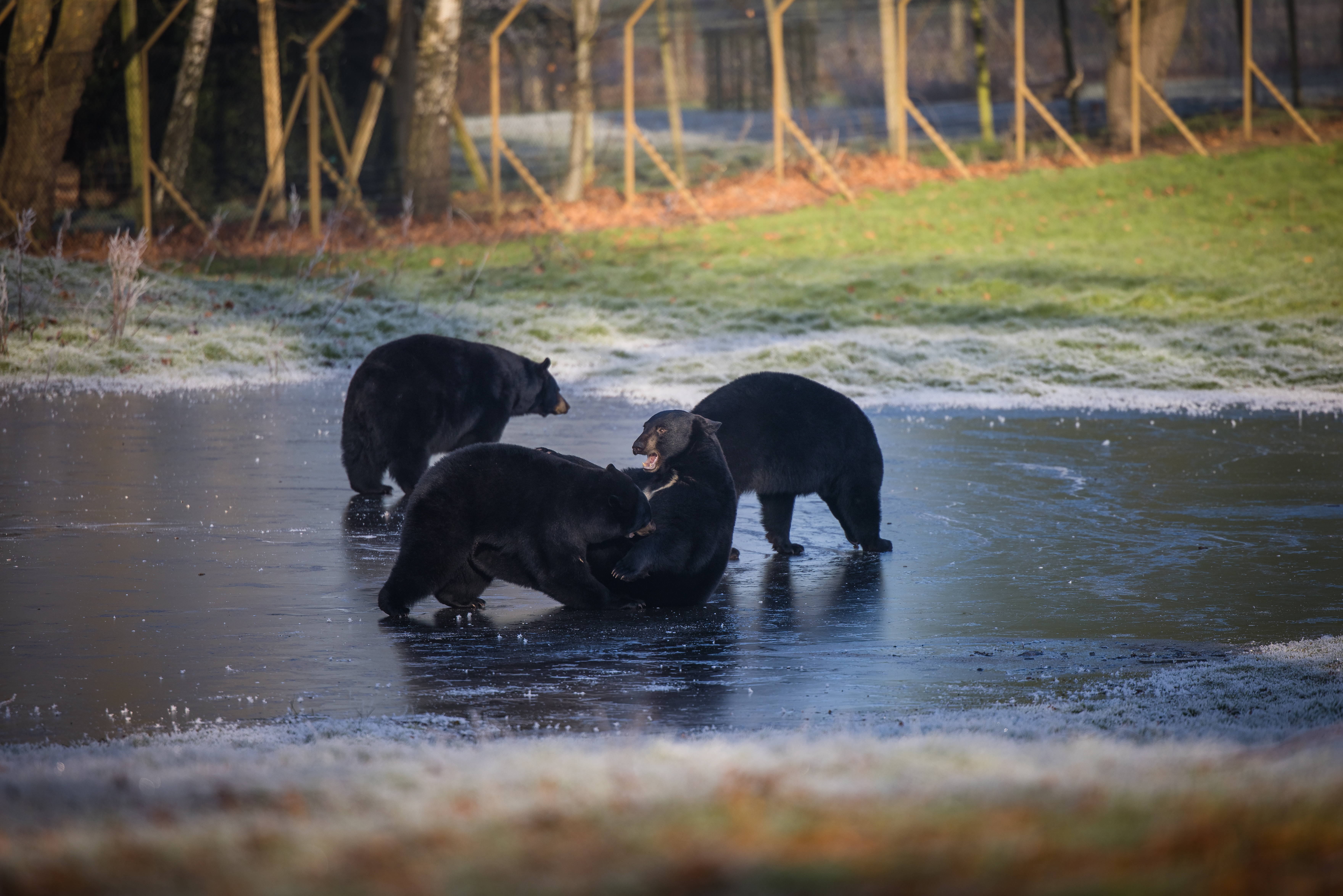 A family of North American black bears at a Bedfordshire safari park have been spotted playing on an icy lake as they embraced the cold weather.