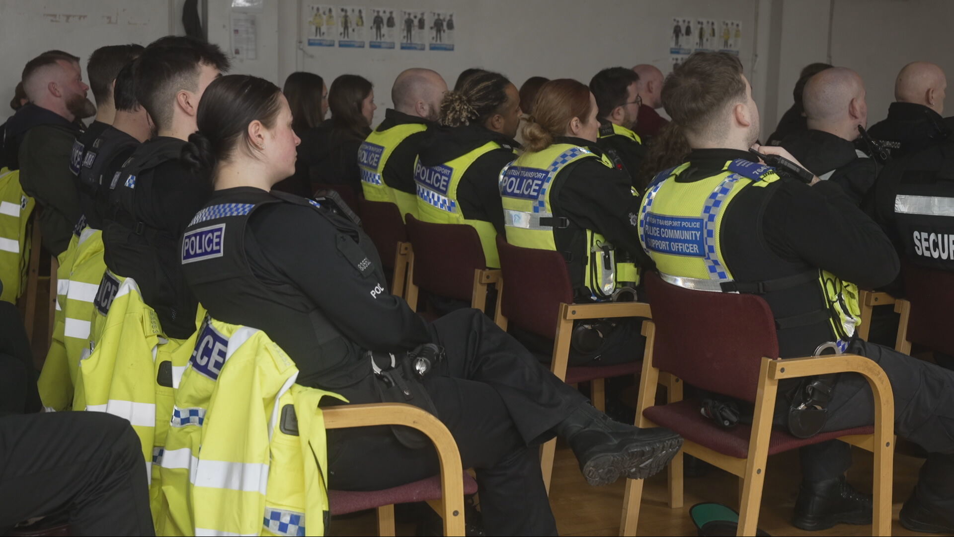 Uniformed officers listen to the presentation about aims and ambitions for the evening ahead, with many here on shift till 2am.