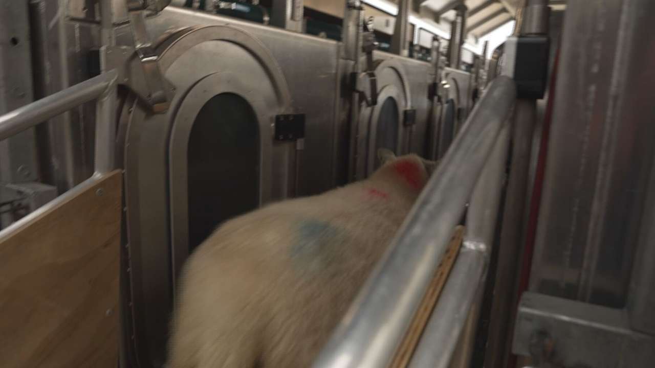 A sheep being led towards the ‘fart chamber’. / Credit: ITV News