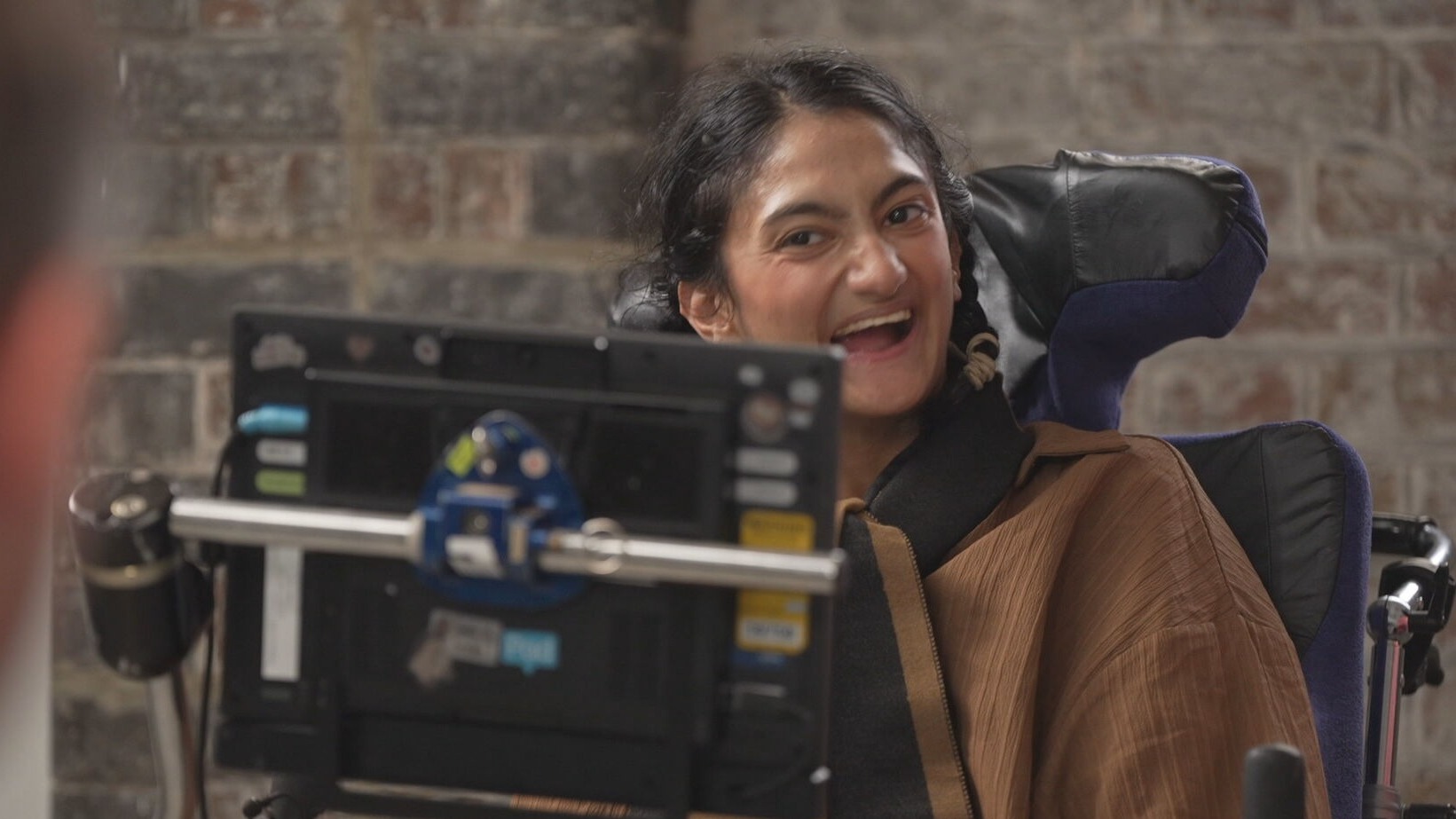 29-year-old Rahima has cerebral palsy and a learning disability, uses a wheelchair to move and a computer to communicate.