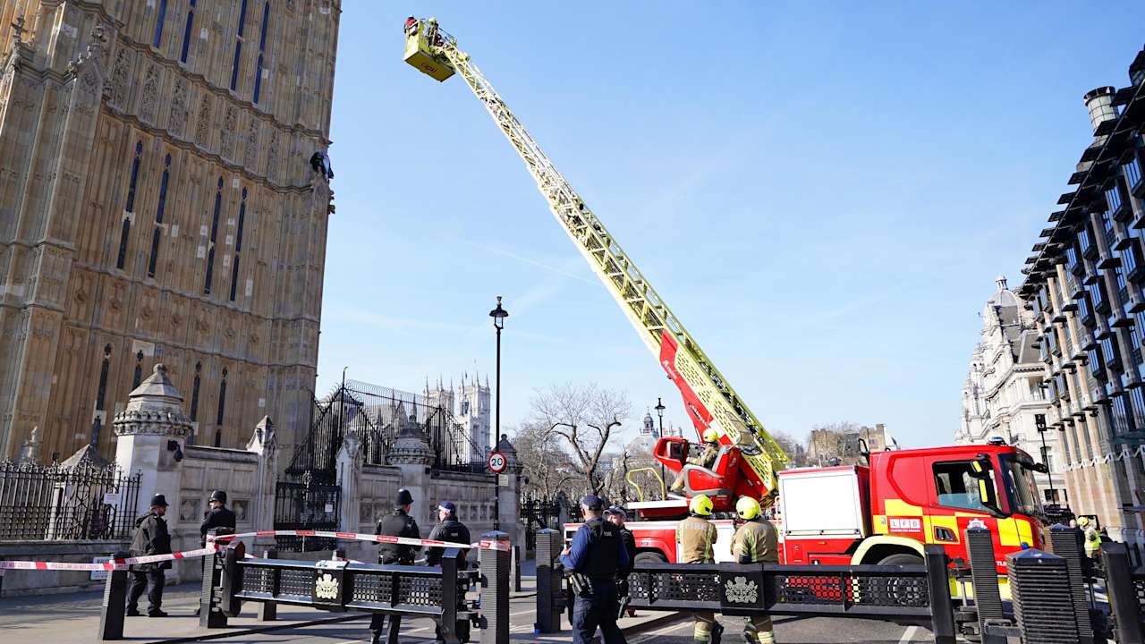 Video on social media shows a barefoot man stood on a ledge holding a Palestine flag several metres up Elizabeth Tower, which houses Big Ben.