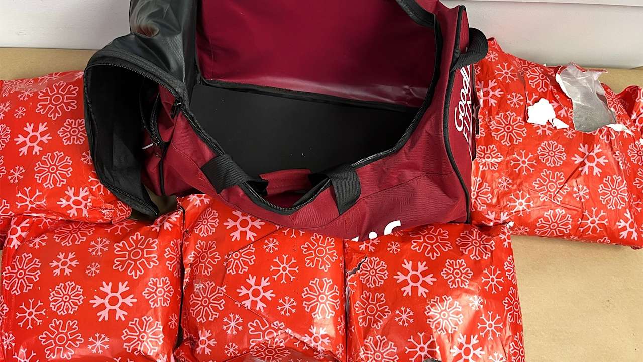 NZ Customs shared images of the “Christmas presents” wrapped in vibrant red paper featuring snowflakes and stored inside a red duffel bag, that the woman allegedly brought onto her flight.