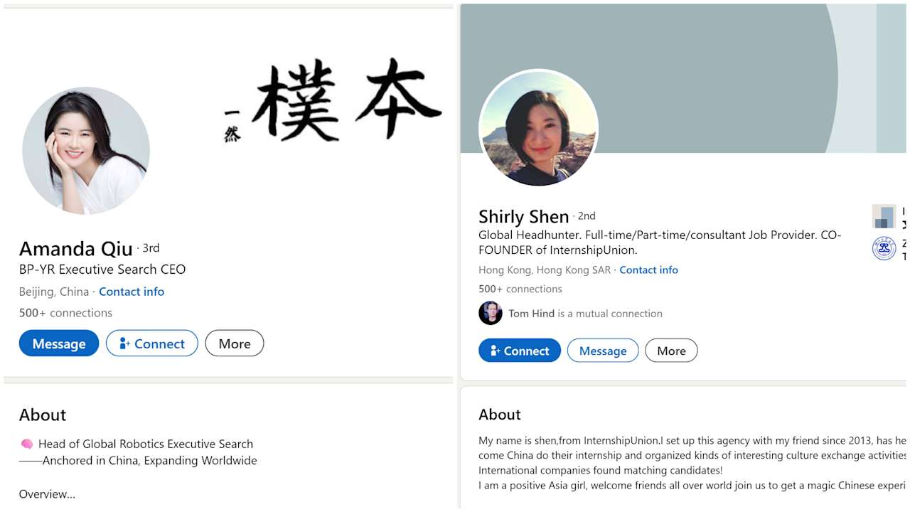 “The alert names two recruitment head-hunters: Amanda Qiu (BR-YR Executive Search) and Shirly Shen (Internship Union). Both are known to be using LinkedIn profiles to conduct outreach at scale on behalf of MSS.