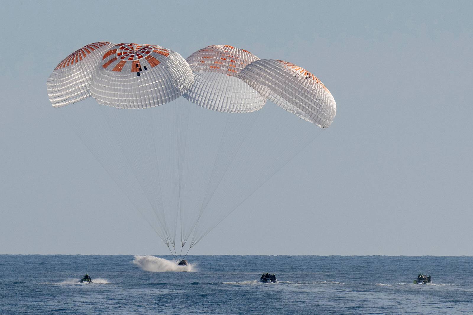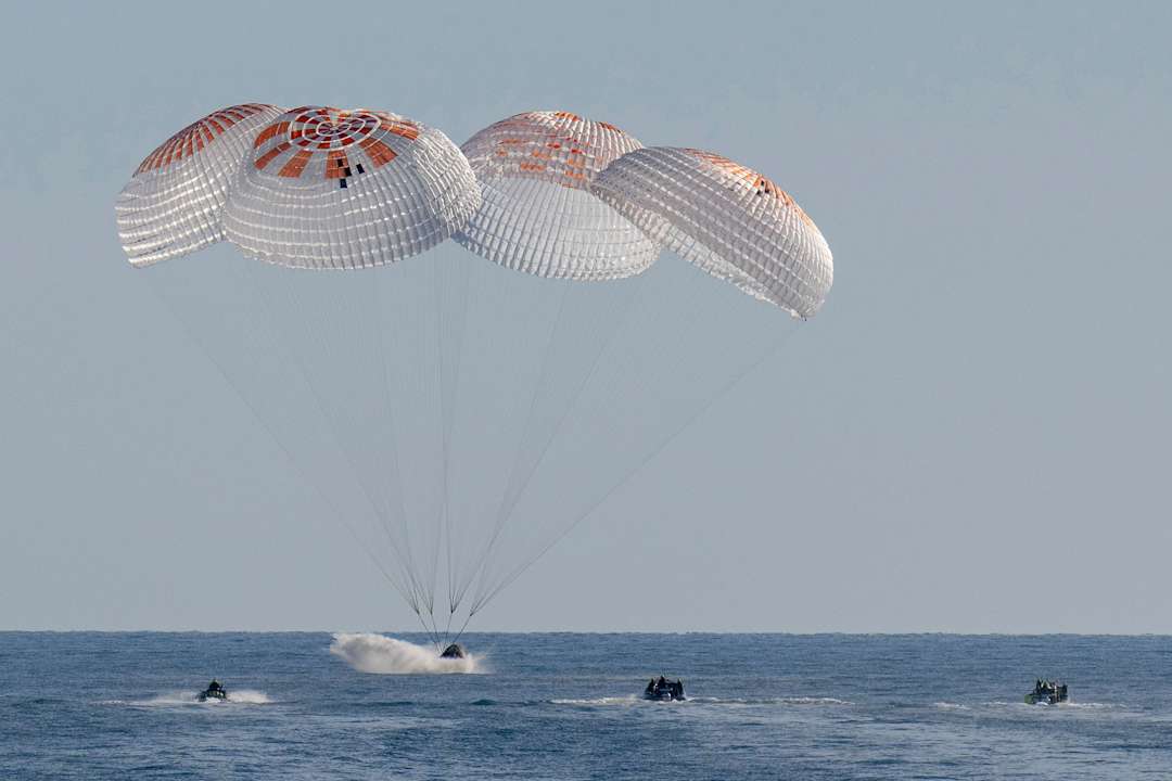 A SpaceX rescue ship waiting nearby hauled the spacecraft out of the water, as dolphins swam around the capsule.
