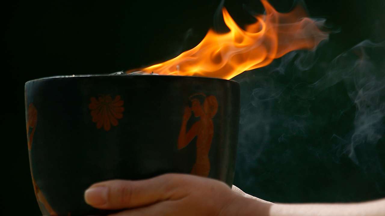 Cloudy skies prevented the traditional lighting, when an actress dressed as an ancient Greek priestess uses the sun to ignite a silver torch.