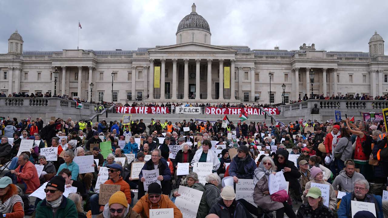 “The majority of people still remaining in Trafalgar Square are onlookers who are holding placards in support of Palestine Action. Arrests continue.”