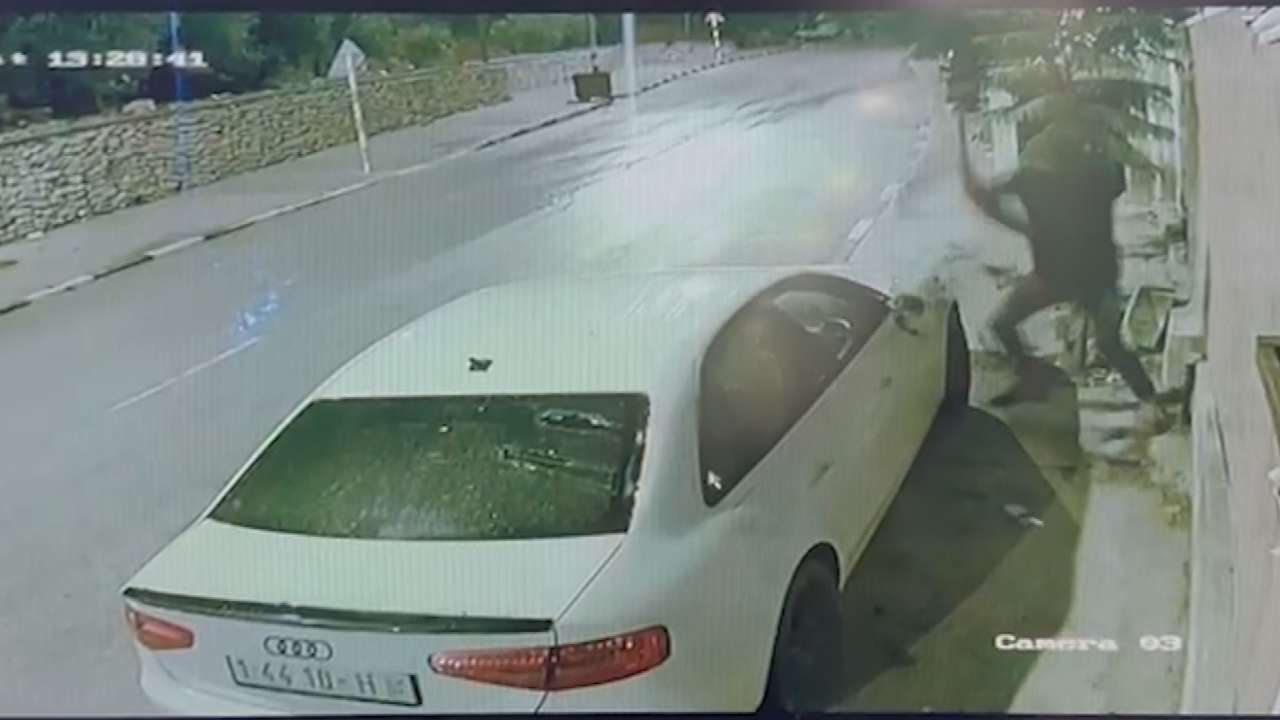Alleged Israeli settlers vandalising a car owned by a Palestinian from the West Bank. / Credit: ITV News