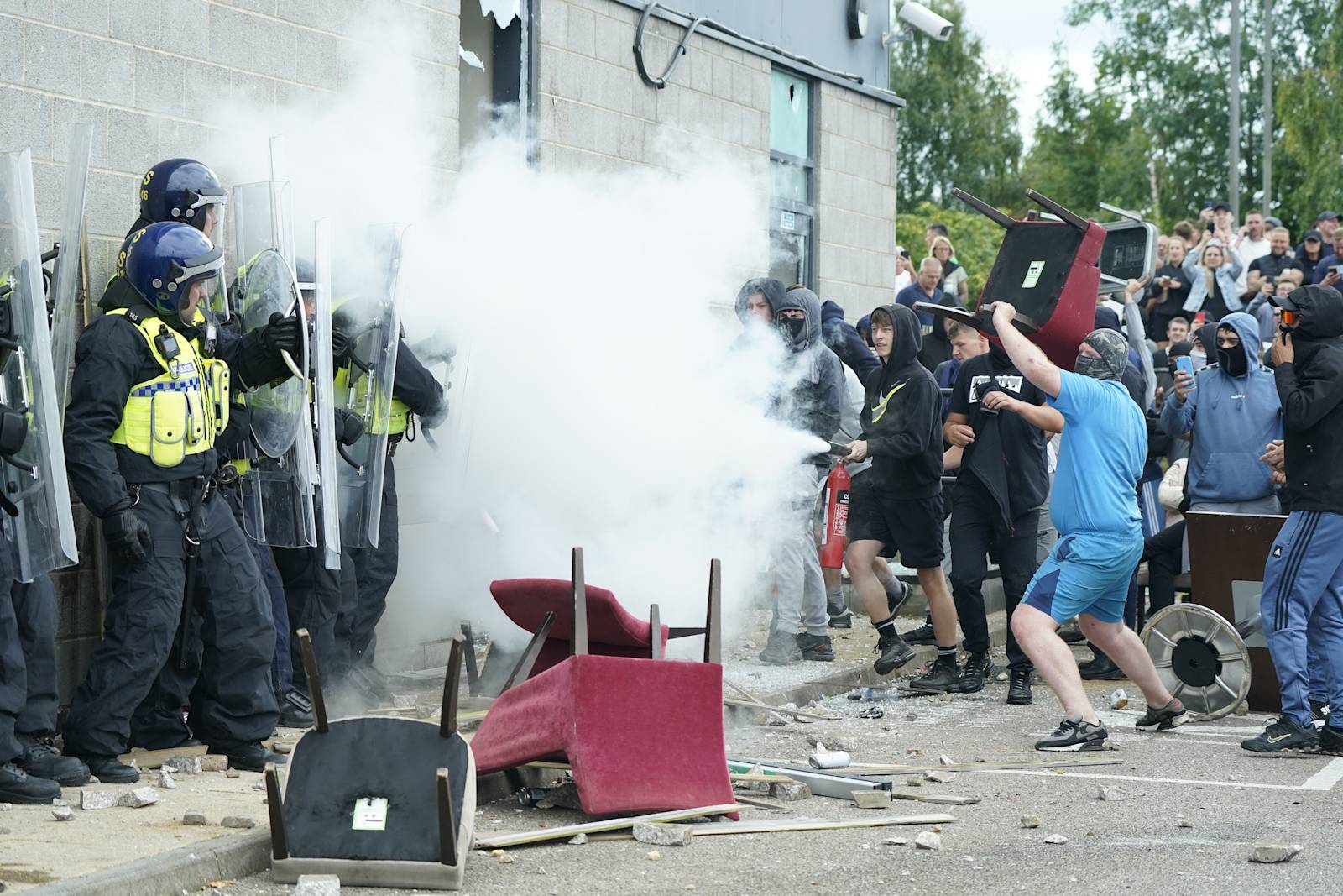Masked rioters smashed windows at the Holiday Inn in Rotherham, South Yorkshire, launching objects including pieces of wood and chairs at officers who lined up in front of the building.