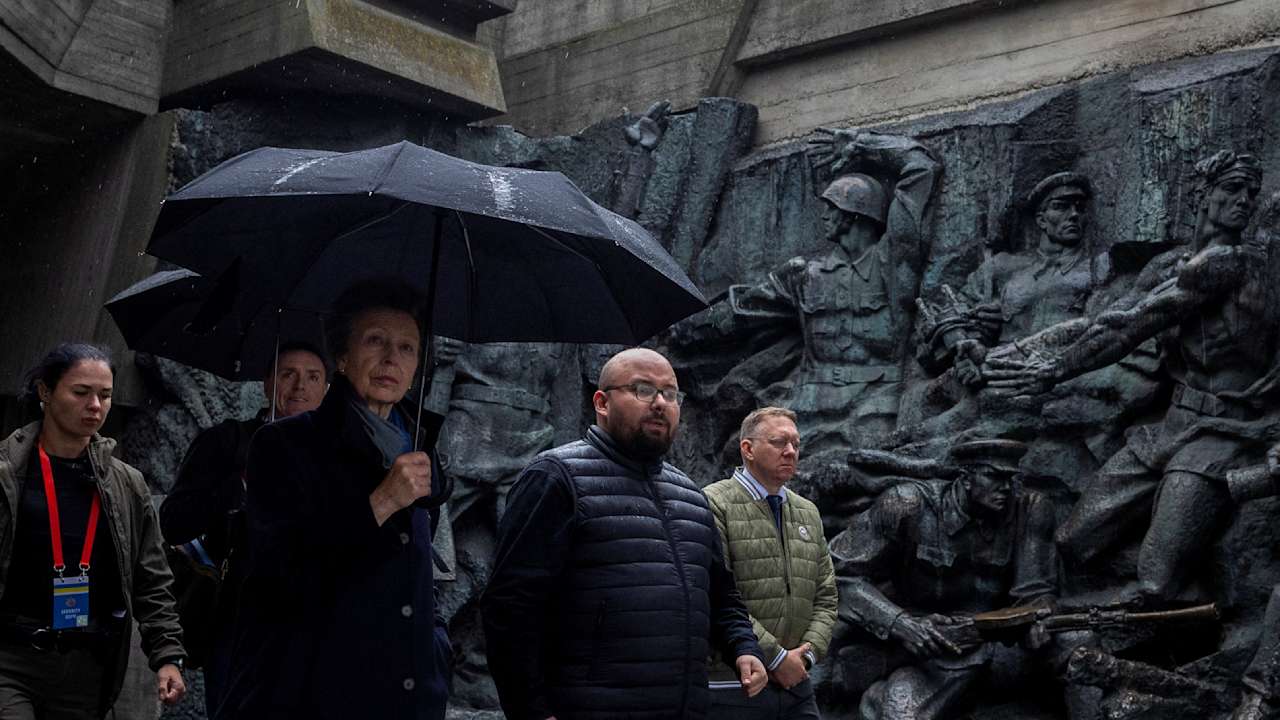 The King’s sister travelled to the war-torn country on Tuesday, where she left a teddy at a children’s memorial in tribute to youngsters killed in the conflict, saying her daughter Zara Tindall had the same bear.