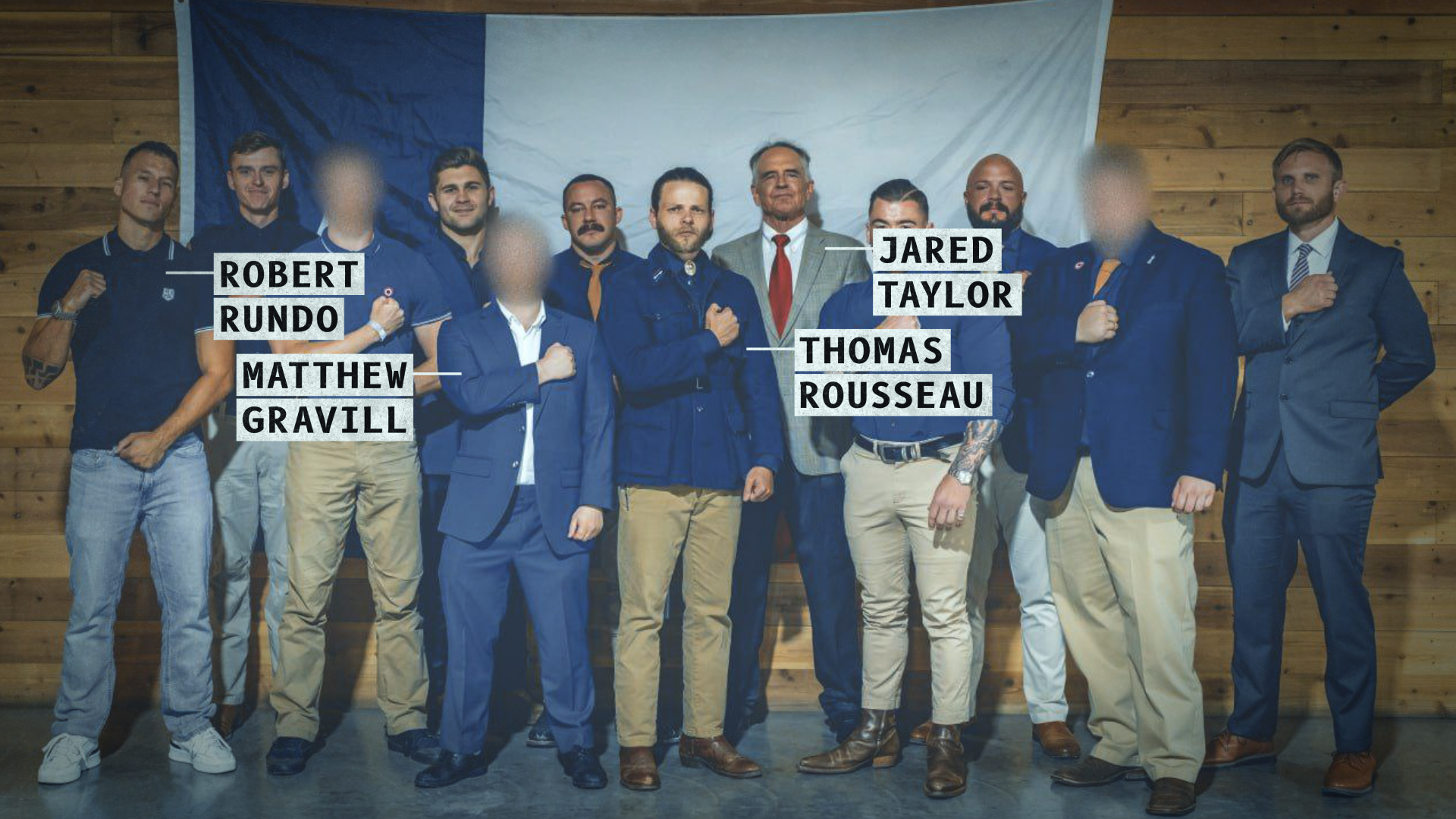 Standing nearby is Thomas Rousseau, the 27-year-old founder of Patriot Front, wearing a blue military-style jacket with epaulettes. Rousseau helped organise the deadly far-right rally in Charlottesville, Virginia, in 2017.