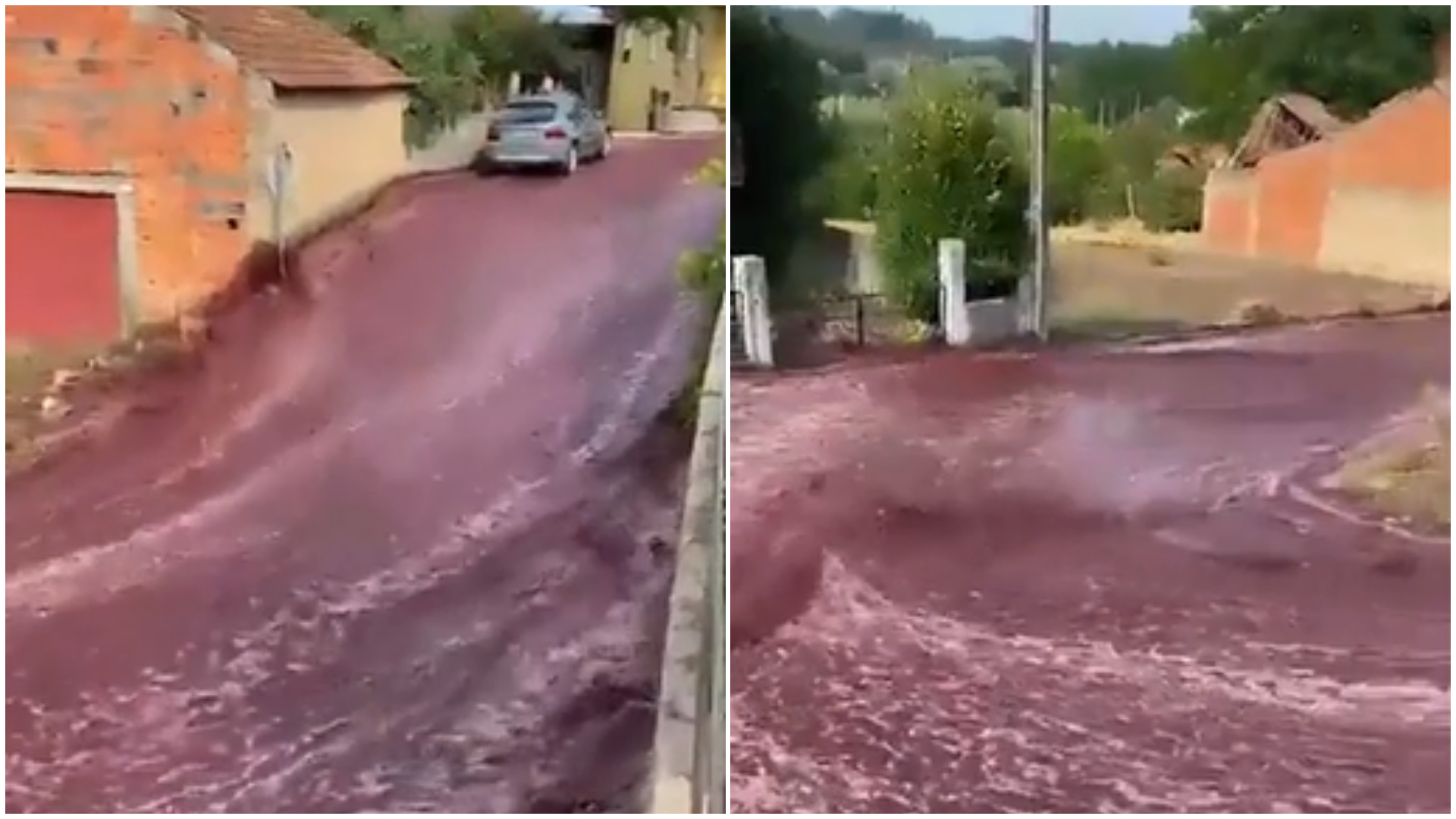 Footage shows the red wine flooding the winding roads of Lourenco do Bairro (Credit X / @AweInspireMe)