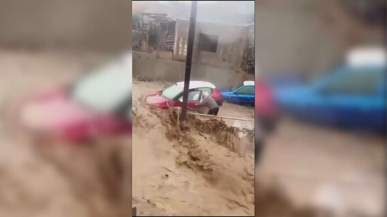 Watch the moment a local resident escapes from a vehicle swept away by the water