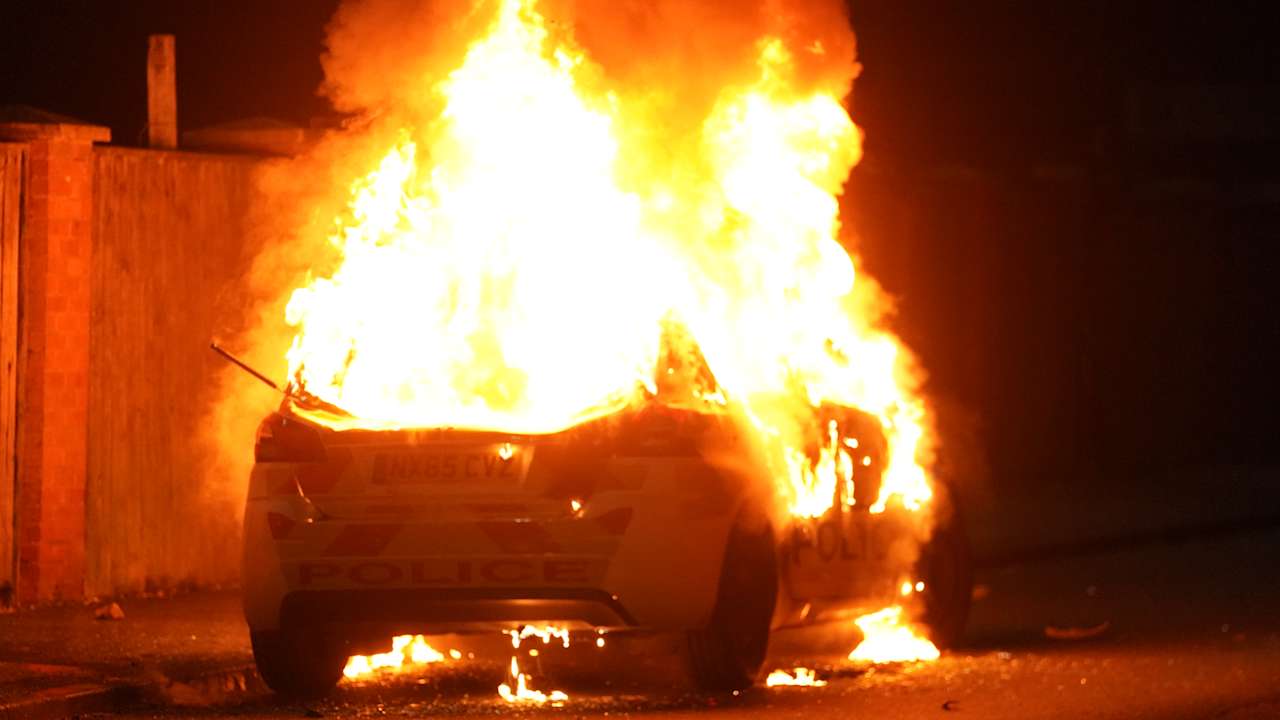 Confrontations continued late into the night in Hartlepool, where demonstrators set fire to a police car and pelted officers with missiles, including glass bottles.