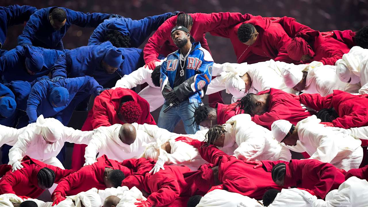 Lamar’s dancers wore red, white, and blue, forming a divided American flag during his performance.