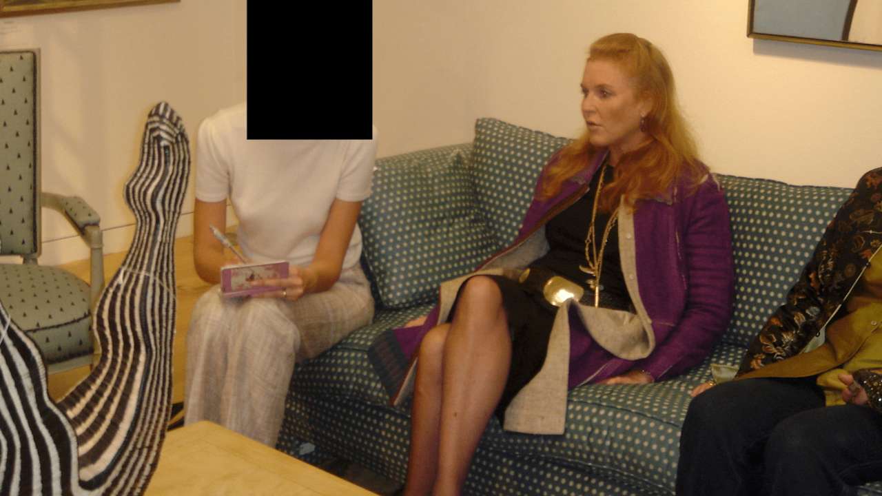One image captures Sarah Ferguson on a sofa and another smiling outdoors.