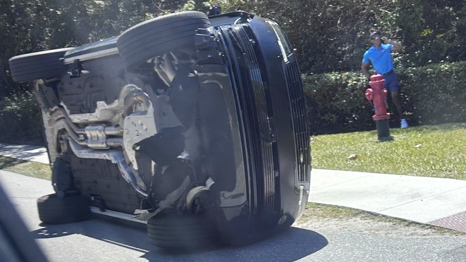 Golfer Tiger Woods pictured standing by his overturned car after being involved in a crash on Jupiter Island, Florida. / Credit: AP Photo/Jason Oteri