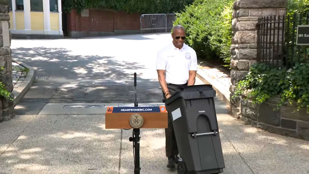 Mayor Eric Adams wheeled out the new ‘rat proof’ bins at a press conference yesterday and has since been mocked after the video of him unveiling his plans for the city went viral on social media.