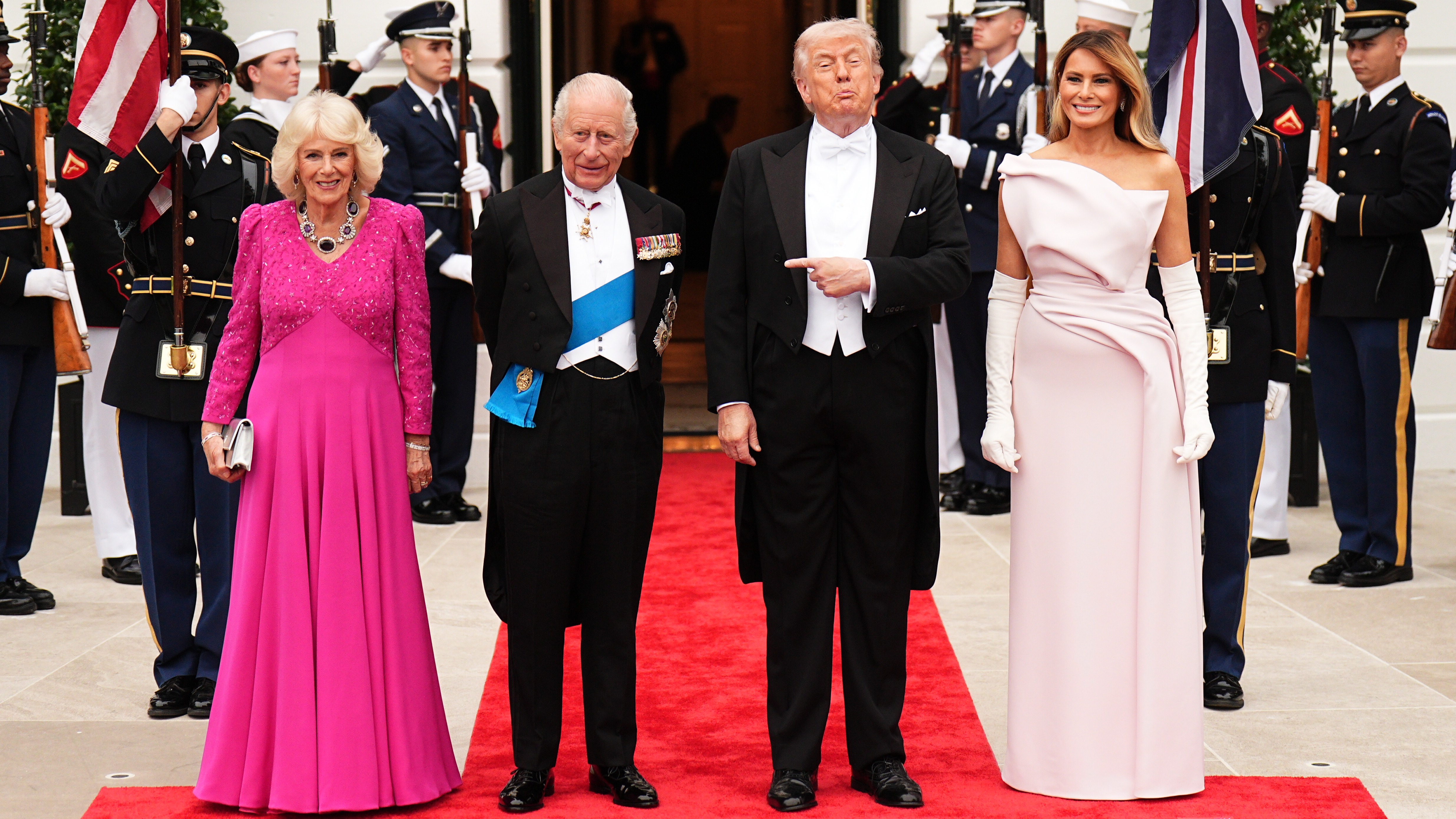 The Queen was dressed in a deep pink Fiona Clare evening gown, and an amethyst and diamond necklace which belonged to Queen Victoria’s mother, the Duchess of Kent, while the King and Mr Trump were in white tie and First Lady Melania Trump wore a pale silk off the shoulder Christian Dior gown for the special gathering.