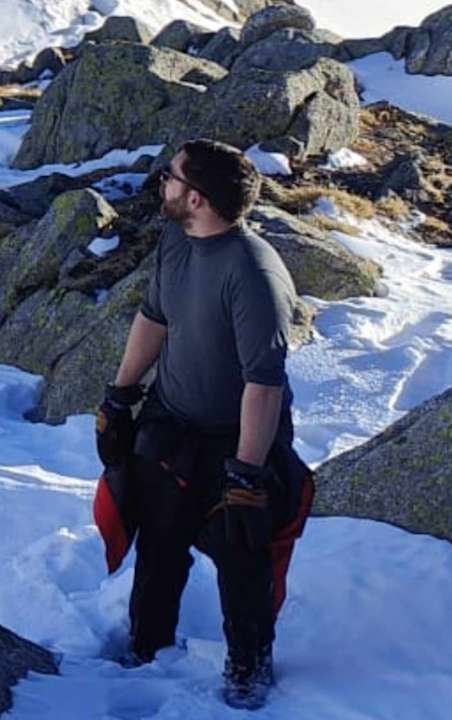 Mr Harris is thought to be last wearing the outfit seen in a photo of him standing in the snow on the mountain, wearing dark trousers, a grey top with a red lined coat and glasses.