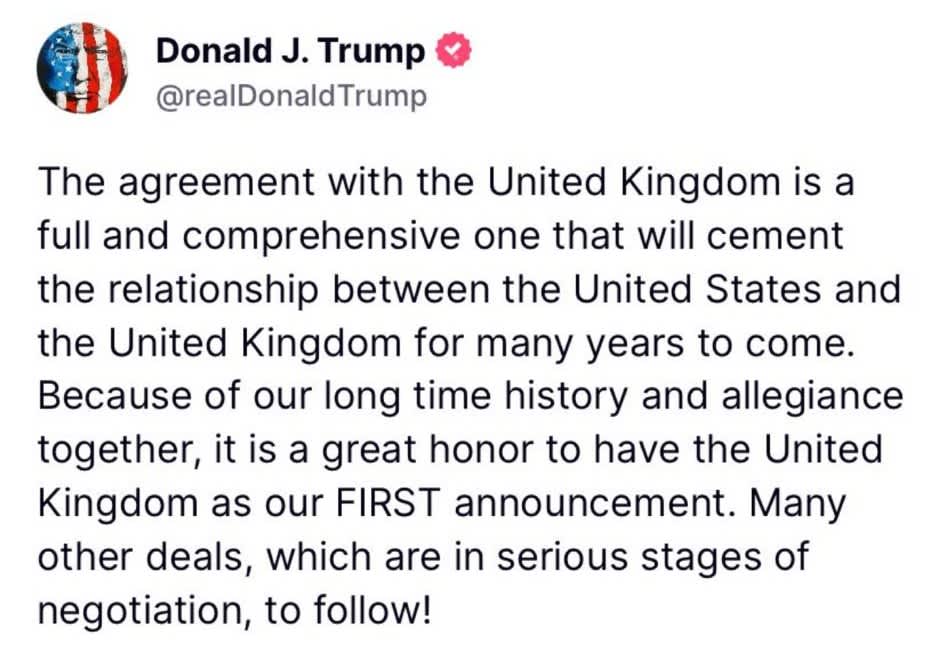 He later posted: “The agreement with the United Kingdom is a full and comprehensive one that will cement the relationship between the United States and the United Kingdom for many years to come.