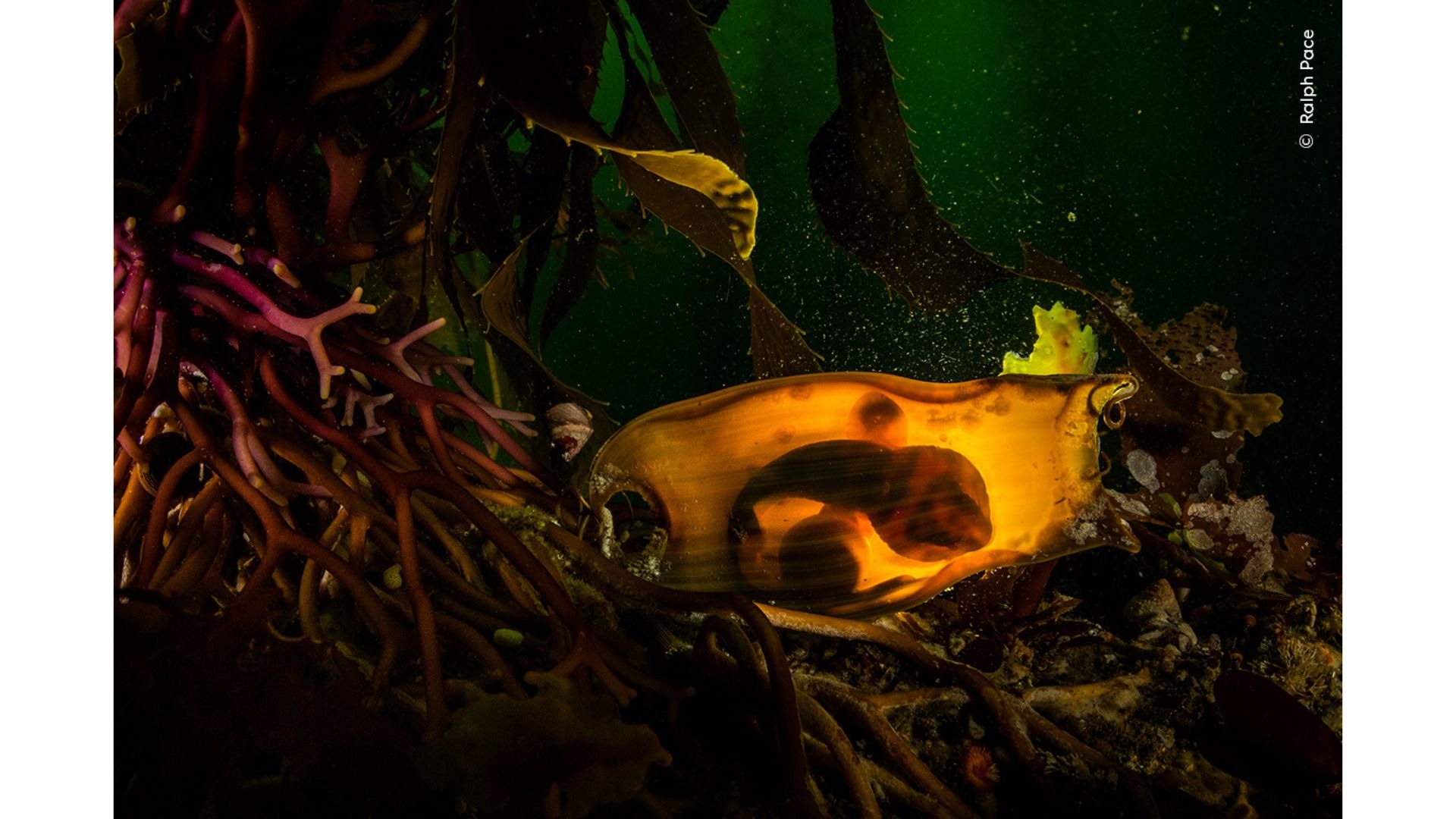 “Faced with strong currents pushing him from side to side, Ralph struggled to keep steady to photograph this egg case, or ‘mermaid’s purse’. He lit the case from behind to reveal the swell shark embryo within, its gill slits and yolk sac clearly visible among the dark kelp forest.