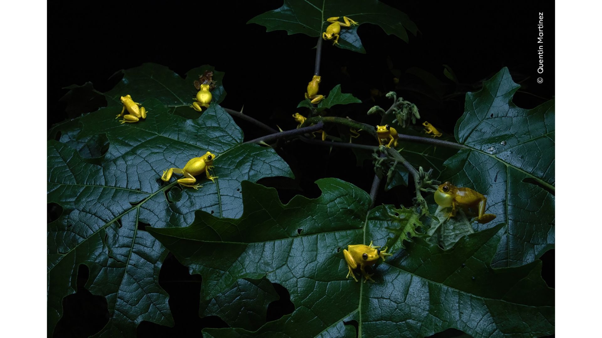 “In persistent rain, Quentin followed a flooded path to a temporary pool in a forest clearing. He framed this scene with a wide-angle lens and used a diffused flash, which didn’t disturb the frogs, to highlight their metallic sheen.