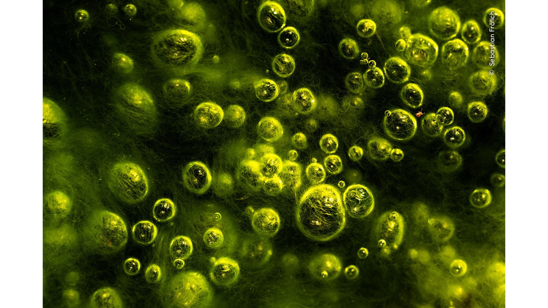 “Sebastian visited this fragile wetland ecosystem to highlight its importance as a vast store of carbon dioxide and as a habitat for diverse wildlife. A tiny springtail ran across escaping gas bubbles rising through the algae, giving this image a sense of scale.