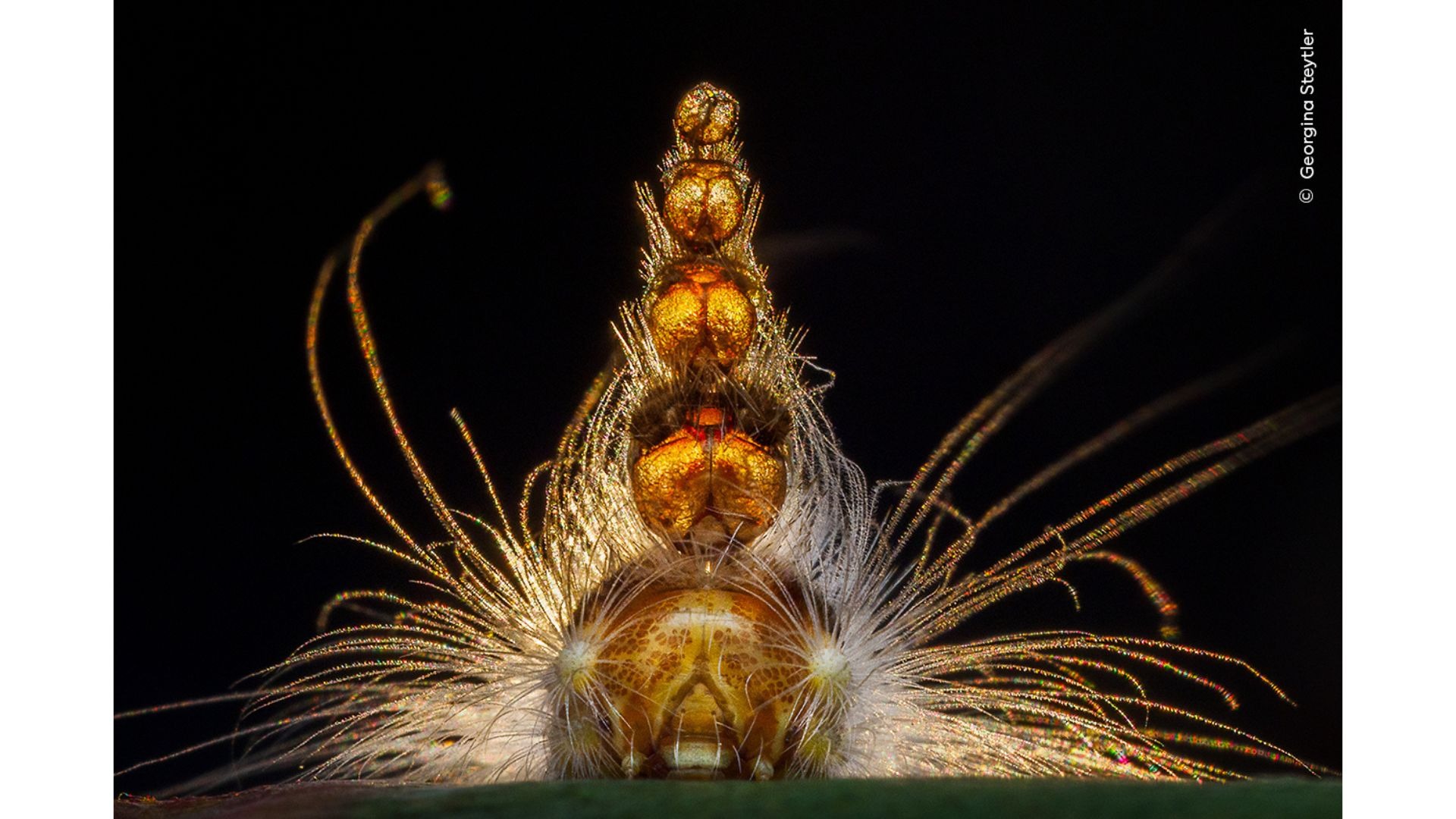 “Georgina had been looking out for this caterpillar for years when she noticed eucalyptus trees bearing skeletonised leaves, telltale signs that the animal had been grazing. She took this image backlit by the setting sun, using a fill-in flash to illuminate the living head at the base of the stack.