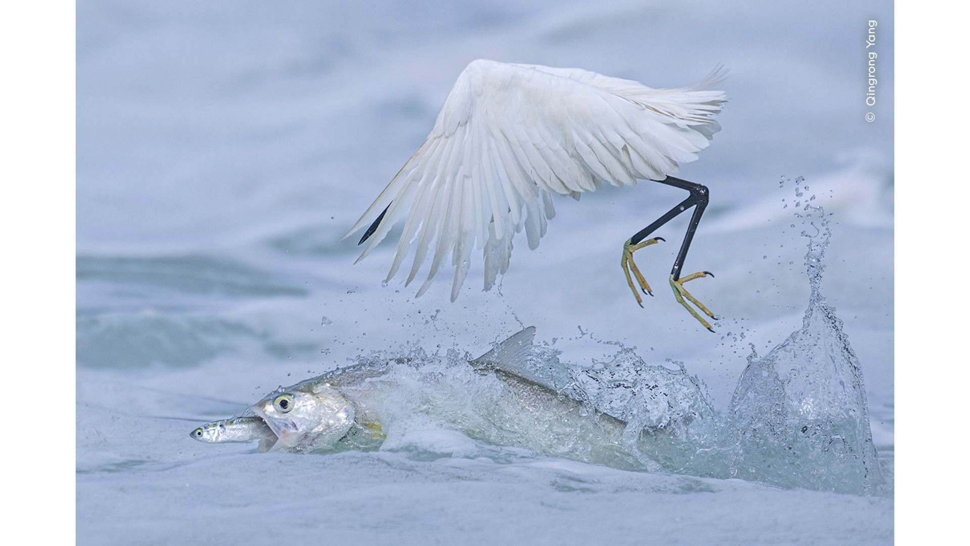 “Qingrong was at Yundang Lake near his home, a place he visits regularly to photograph the feeding frenzies: Little egrets patrol the surface, ready to pounce on fish leaping to escape underwater predators.